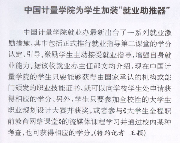 《教育與職業(yè)》雜志刊登題為“中國計(jì)量學(xué)院為學(xué)生加裝‘就業(yè)助推器’”的文章報(bào)道我校出臺(tái)就業(yè)激勵(lì)措施情況。
