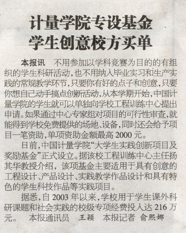 4月5日,《錢江晚報》發表題為“計量學院專設基金 學生創意校方買單”的文章報道我校設立“大學生實踐創新項目及獎勵基金”情況。