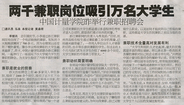 《今日早報》登載文章介紹中國計量學院兼職崗位招聘會情況