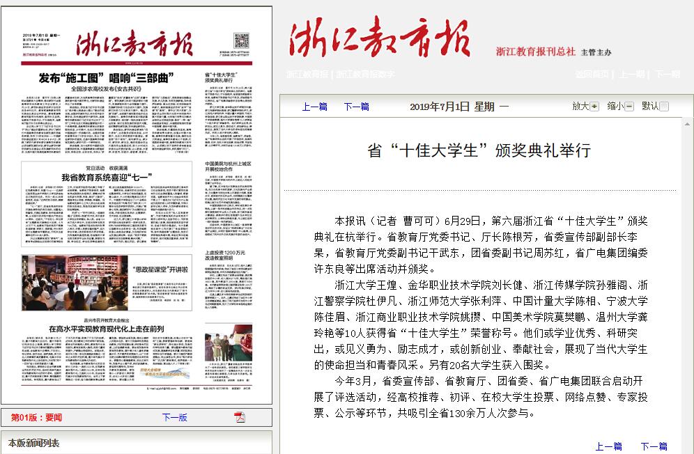 【浙江在線】第6屆浙江省“十佳大學生”評選(中國計量大學-陳相)