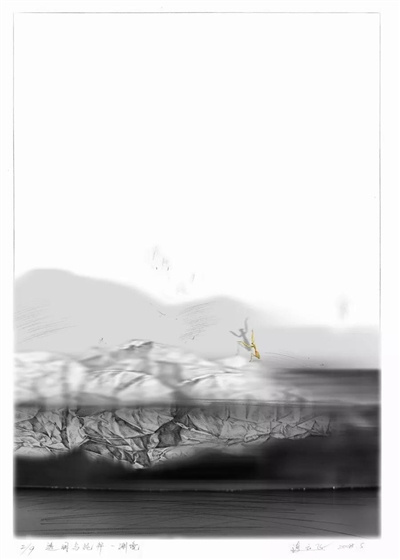 2018年完成的國家藝術基金項目成果《共生意趣》系列作品中,凌云飛結合版畫和數碼技術刻畫了斑馬初進房門的無措、梅花鹿面對流水時的懵懂、白鶴迎著陽光的詩意遐想、長頸鹿探進窗戶的驚奇和企鵝在樓梯上的惶恐。通過這些版畫作品,凌云飛希望向人們傳遞這樣一個信息:動物的生存地被人類逐漸侵占,自然生態危機終將導致社會環境的危機。