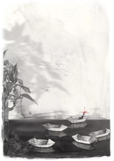 “畫的靈感不是一蹴而就的,也不是有意形成的,畫面內容和靈感的來源之一是當時遭遇的事情和所處的環境,這些都會潛移默化地影響著我的創作?!绷柙骑w說。在作品《新自然》中,紙船在鏡面上游弋,蜻蜓棲息在小小紙船上,畫邊一株不知名的小植物茁壯生長,“這一切記錄著我當時無拘無束、初涉社會的一種安逸的生活狀態。”
