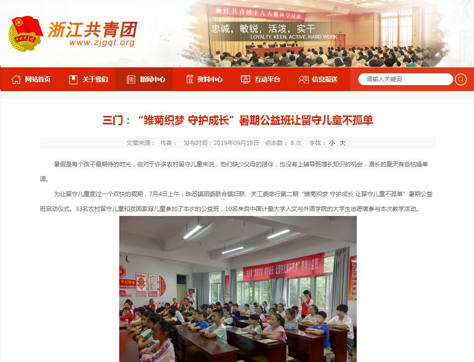 為讓留守兒童度過一個歡快的假期,7月4日上午,珠岙鎮(zhèn)團委聯(lián)合鎮(zhèn)婦聯(lián)、關(guān)工委舉行第二期“雛菊織夢 守護成長 讓留守兒童不孤單”暑期公益班啟動儀式。33名農(nóng)村留守兒童和貧困家庭兒童參加了本次的公益班,10名來自中國計量大學(xué)人文與外語學(xué)院的大學(xué)生志愿者參與本次教學(xué)活動。