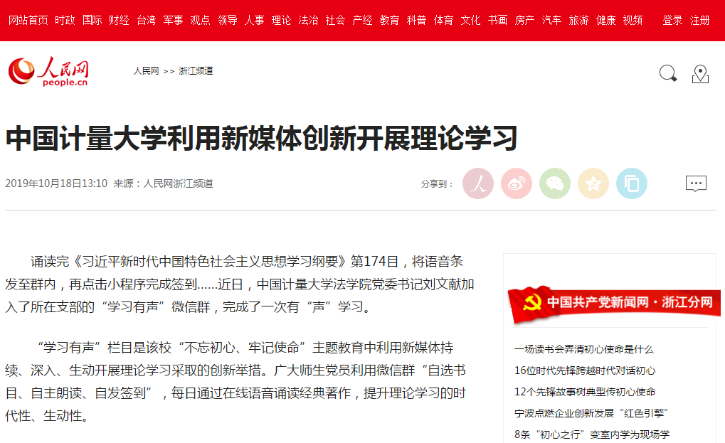 誦讀完《習近平新時代中國特色社會主義思想學習綱要》第174目,將語音條發至群內,再點擊小程序完成簽到……近日,中國計量大學法學院黨委書記劉文獻加入了所在支部的“學習有聲”微信群,完成了一次有“聲”學習。