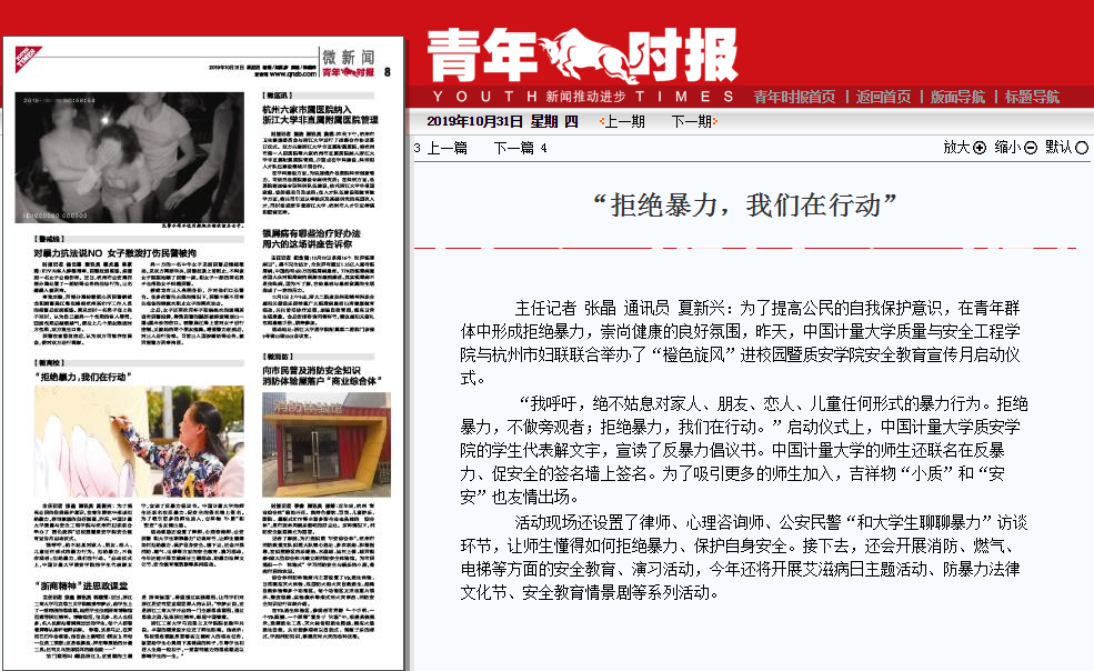 為了提高公民的自我保護(hù)意識(shí),在青年群體中形成拒絕暴力,崇尚健康的良好氛圍,昨天,中國(guó)計(jì)量大學(xué)質(zhì)量與安全工程學(xué)院與杭州市婦聯(lián)聯(lián)合舉辦了“橙色旋風(fēng)”進(jìn)校園暨質(zhì)安學(xué)院安全教育宣傳月啟動(dòng)儀式。