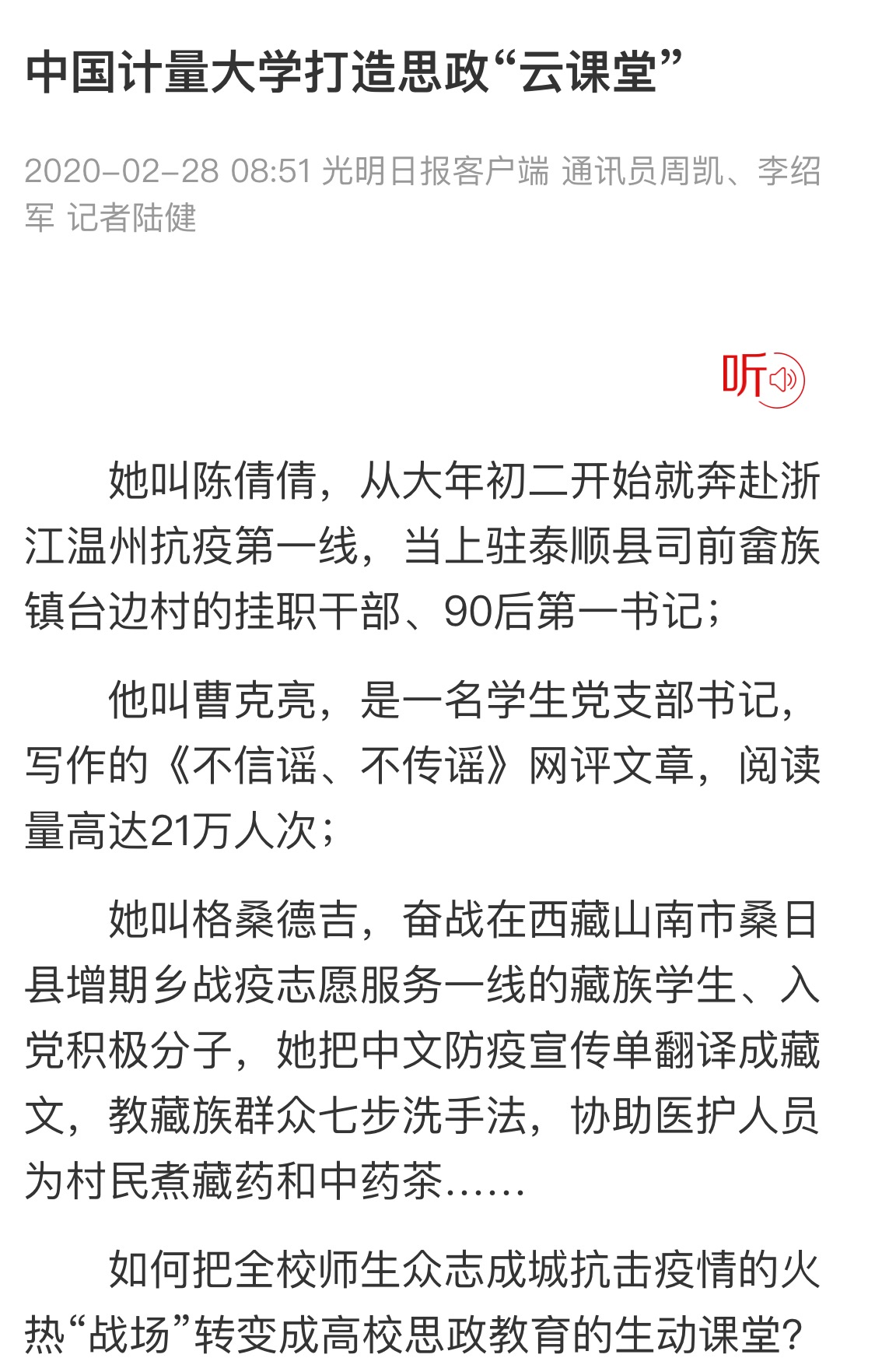 [青年時報新聞客戶端]中國計量大學(xué)把師生一線防疫的生動故事寫入思政“云課堂”