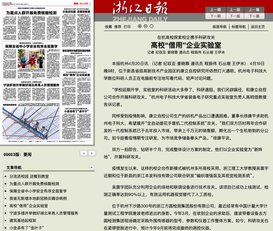 位于杭州下沙路300號的浙江方圓檢測集團股份有限公司,最近經(jīng)常有中國計量大學(xué)計量測試工程學(xué)院唐波老師進出的身影。今年3月,在收到企業(yè)的求助后,唐波帶著設(shè)備去方圓檢測集團現(xiàn)場確定采購?fù)鈬鷤鞲衅鞯男吞枴?shù)和儀器工作整體方案。如今,科研攻關(guān)也在緊鑼密鼓進行中,預(yù)計今年9月前將完成最終的測控儀器。