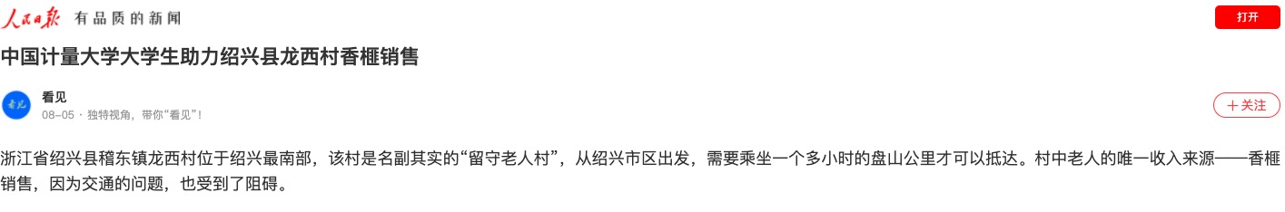 中國計(jì)量大學(xué)生命科學(xué)學(xué)院的一群學(xué)生注意到了他們的困難,成立了一支十一人的隊(duì)伍,并安排其中四人成立實(shí)地考察小隊(duì)于7月28日赴浙江省紹興縣稽東鎮(zhèn)龍西村實(shí)地考察,開設(shè)了龍西村第一個(gè)網(wǎng)上銷售香榧的渠道,通過微信公眾號(hào)宣傳、抖音直播平臺(tái)、村委-高校聯(lián)合等銷售方式,短短五天時(shí)間,幫助龍西村獲益上千元。