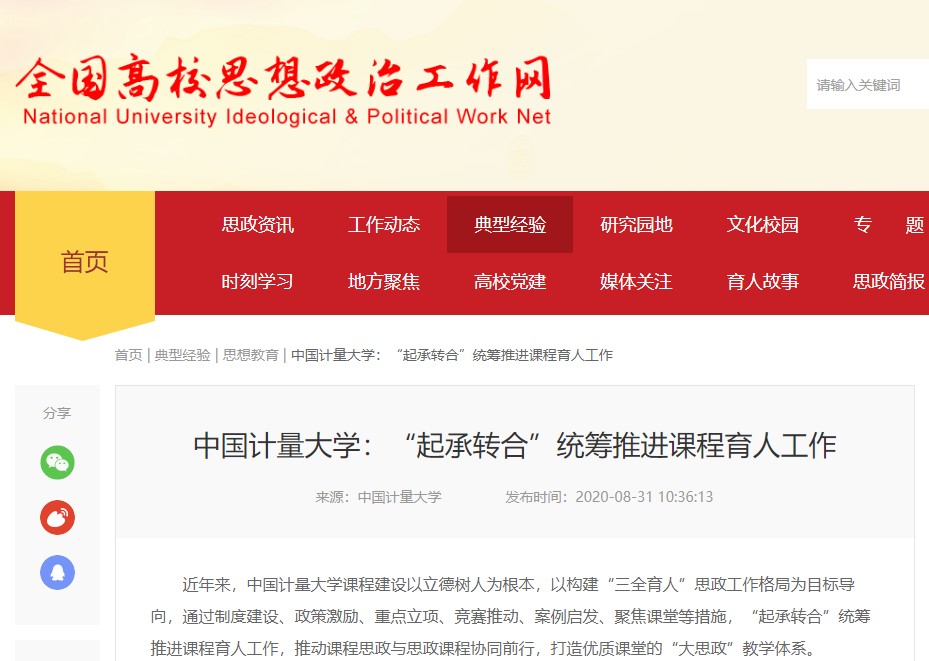 近年來,中國計量大學課程建設以立德樹人為根本,以構建“三全育人”思政工作格局為目標導向,通過制度建設、政策激勵、重點立項、競賽推動、案例啟發、聚焦課堂等措施,“起承轉合”統籌推進課程育人工作,推動課程思政與思政課程協同前行,打造優質課堂的“大思政”教學體系。