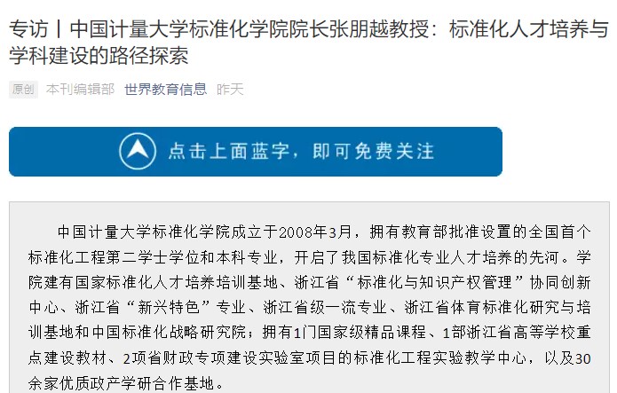 《世界教育信息》:從全球領(lǐng)域來(lái)看標(biāo)準(zhǔn)化學(xué)科是如何發(fā)展的?中國(guó)計(jì)量大學(xué)作為中國(guó)標(biāo)準(zhǔn)化學(xué)科發(fā)展的重鎮(zhèn)是如何做的?
