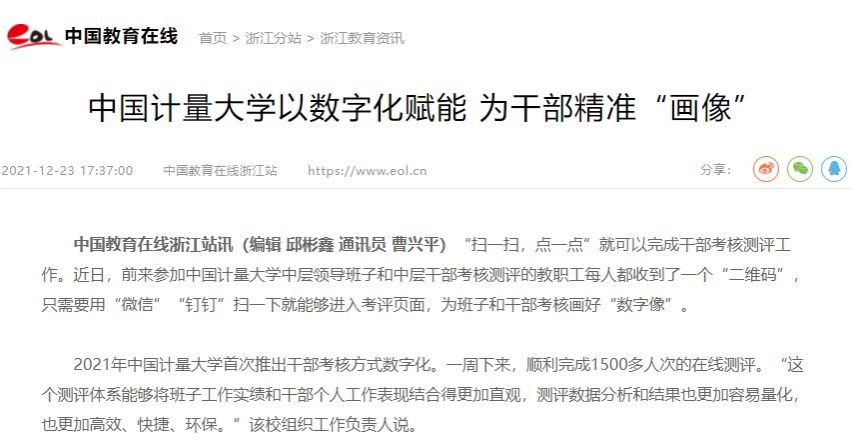 2021年中國計量大學首次推出干部考核方式數字化。一周下來,順利完成1500多人次的在線測評。“這個測評體系能夠將班子工作實績和干部個人工作表現結合得更加直觀,測評數據分析和結果也更加容易量化,也更加高效、快捷、環保。”該校組織工作負責人說。
