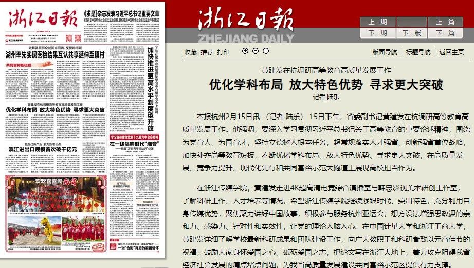在浙江傳媒學(xué)院,黃建發(fā)走進(jìn)4K超高清電競綜合演播室與韓忠影視美術(shù)研創(chuàng)工作室,了解科研工作、人才培養(yǎng)等情況,希望浙江傳媒學(xué)院繼續(xù)緊跟時代、突出特色,充分利用自身傳媒優(yōu)勢,聚焦聚力講好中國故事,積極參與服務(wù)杭州亞運(yùn)會,想方設(shè)法增強(qiáng)思政課的親和力、感染力、針對性和實效性,讓黨的理論入腦入心。在中國計量大學(xué)和浙江工商大學(xué),黃建發(fā)詳細(xì)了解學(xué)校最新科研成果和團(tuán)隊建設(shè)工作,向廣大教職工和科研者致以元宵佳節(jié)的祝福,鼓勵大家身懷愛國之心、砥礪愛國之志,把論文寫在浙江大地上,著力攻克阻礙我省經(jīng)濟(jì)社會發(fā)展的痛點(diǎn)堵點(diǎn)問題,為我省高質(zhì)量發(fā)展建設(shè)共同富裕示范區(qū)提供有力支撐。