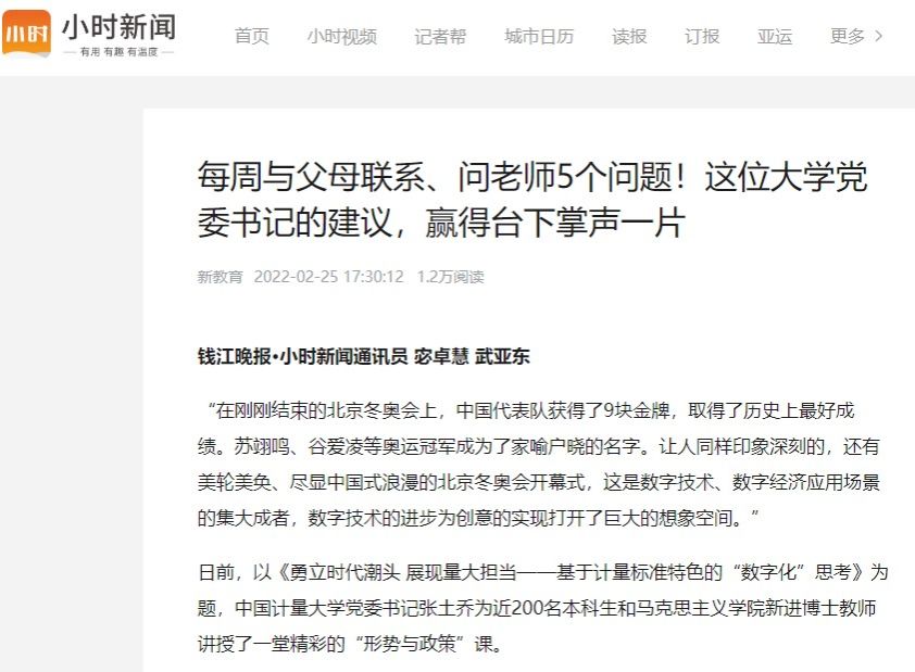 2月23日,校黨委書記張土喬以《勇立時代潮頭 展現(xiàn)量大擔當——基于計量標準特色的“數(shù)字化”思考》為題,為近200名本科生和馬克思主義學院新進博士教師講授了一堂精彩的“形勢與政策”課,受到媒體廣泛關(guān)注。學習強國、新浪、錢江晚報·小時新聞、科技金融網(wǎng)、中國教育在線等媒體進行報道。