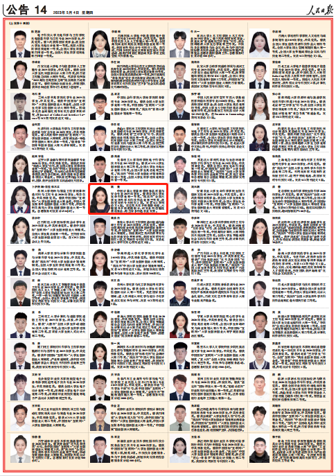 2023年5月4日《人民日報》第14版,公告2021—2022學年度本專科生國家獎學金獲獎學生代表名錄,我校量新學院姚競上榜。