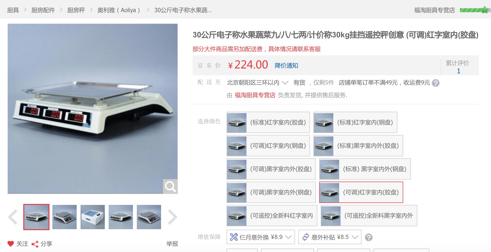 這樣的現象也存在于其他網購平臺。澎湃新聞以相同關鍵詞在京東搜索,發現也有多家店鋪出售此類可作弊電子計價秤。以“福淘廚具專營店”為例,該店售賣的“30公斤電子秤”在商品名中寫明了“九/八/七兩計價秤”、“掛擋遙控”等特點。