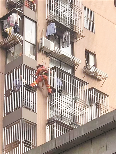 女孩雙手緊緊抓著保籠,也不敢說話。“別怕,我們是來救你的。”劉銀輝靠過去將女孩抱住,完成了與小伙子的“空中接力”,然后抱著女孩慢慢挪到右側的窗口,將孩子交給樓內的救援人員。前后10分鐘左右,女孩成功獲救。