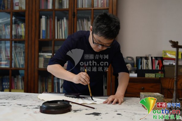 記者聯系到輔導員沈鈺,他告訴記者,他出生于湖筆之都浙江湖州的善璉鎮,從小就受到書法熏陶,平時工作之余也經常讀貼、臨帖,這個習慣已堅持有十年左右。