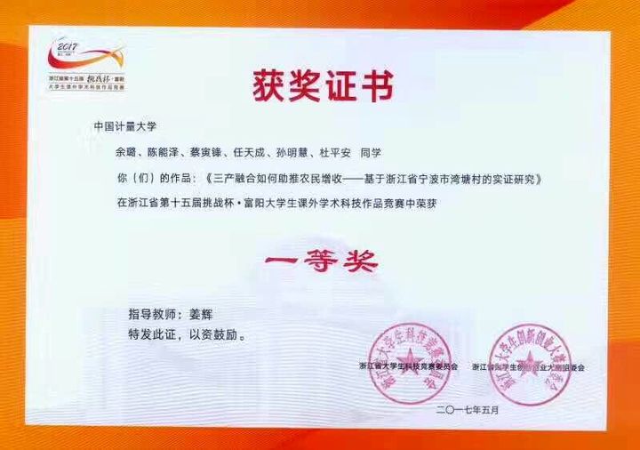 日前,由中國計量大學的余璐等6名大學生聯合出品的《三產融合,如何助推農民增收》調研報告,獲得全省大學生課外學術科技大賽一等獎。和其他獲獎代表一起,余璐等6名同學受到副省長成岳沖、省政府副秘書長李云林、團省委書記朱林森的表彰。