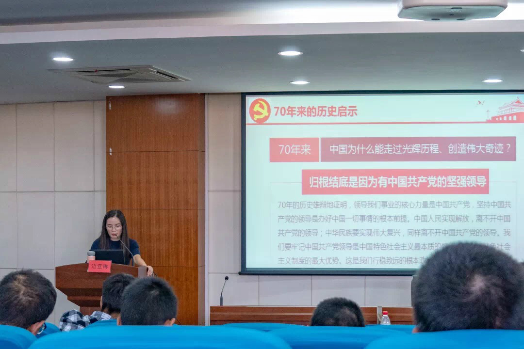 “70年來中國為什么能走過光輝歷程、創造偉大奇跡?歸根結底是因為有中國共產黨的堅強領導。中國人民實現解放,離不開中國共產黨的領導;中華民族要實現偉大復興,同樣離不開中國共產黨的領導。”課堂的最后,邊亞琳引用了習近平總書記對當代青年的六點要求,激勵同學們樹立遠大理想,熱愛偉大祖國,擔當時代責任,勇于砥礪奮斗,練就過硬本領,錘煉品德修行,為中國的建設添磚加瓦。