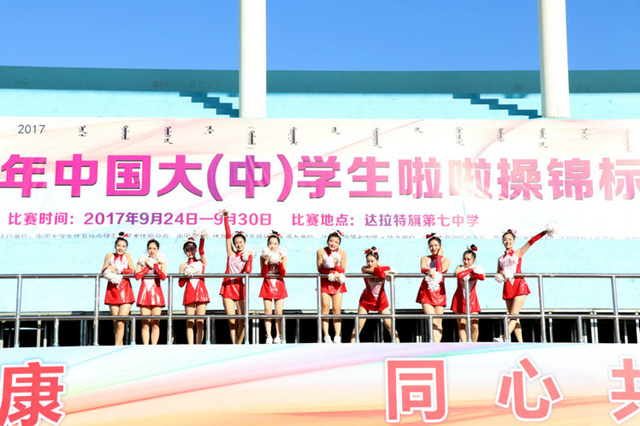 金秋九月,2017年全國大(中)學生啦啦操錦標賽在美麗的內蒙古達拉特旗隆重召開。本次競賽歷時7天,于2017年9月24日至30日在內蒙古達拉特旗第七中學舉行。本屆賽事由中國大學生體育協會、全國中學生體育協會主辦,內蒙古自治區教育廳、鄂爾多斯教育局、達拉特旗人民政府、達拉特旗教育局共同協辦,中國大學生體育協會健美操藝術體操分會、中國中學生體育協會健美操分會全程執行督辦的全國性體育賽事,此次比賽共有清華大學、北京體育大學、廣西大學、中國藥科大學、中國計量大學等43支大學隊伍及26支中學隊伍,共計1185名來自全國各地的運動員參加本次賽事。