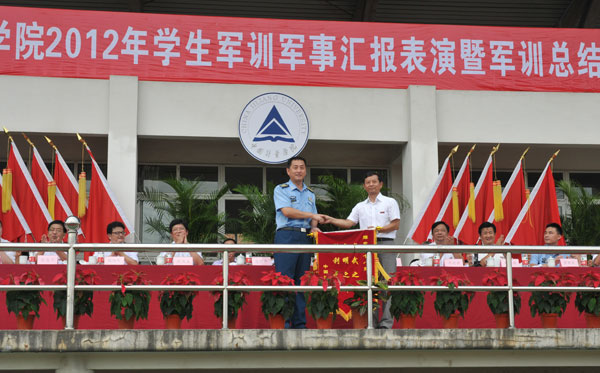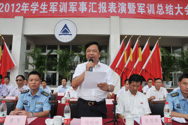 副校長宋明順作軍訓總結報告。他首先代表學校,向關心和支持我校軍訓工作的空28師首長和全體教官表示衷心感謝,向順利完成軍訓任務的2012級同學表示熱烈祝賀!宋明順指出, 14天的軍訓生活,同學們出色地完成了各種軍訓項目,掌握了各項基本軍事技能,培養了艱苦奮斗、勇敢頑強的優良作風,磨礪了百折不撓的意志品質。他強調,這次軍訓的成功進行,有賴于空軍28師和學校各級部門的緊密合作、精心部署,有賴于教官們科學施訓、嚴格管理,有賴于同學們的艱苦奮斗、頑強拼搏。最后,他叮囑同學們,緊張而短暫的軍訓生活即將結束,但堅忍不拔、吃苦耐勞、團結協作的計量青年精神,卻需要我們持之以恒地堅持和鍛煉。