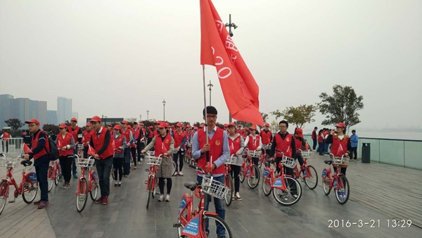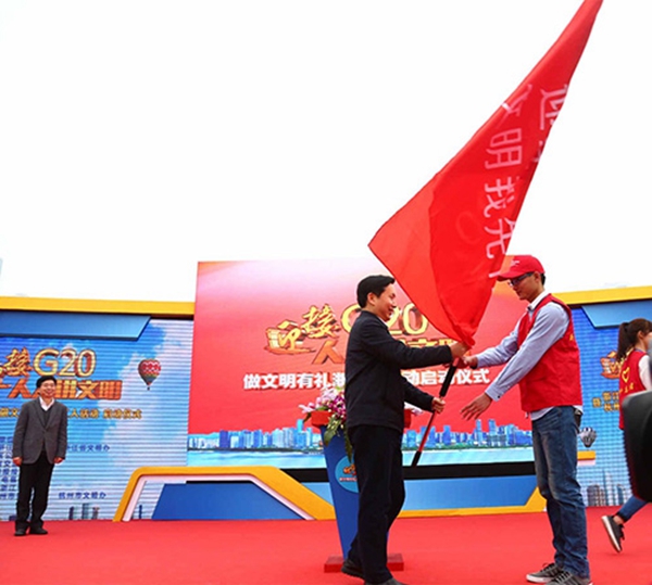 在本次啟動儀式中省委常委、宣傳部長葛慧君做了重要講話并宣布活動正式啟動,她倡導全省公民踐行“禮讓斑馬線、文明過馬路、排隊守秩序、禮儀待賓客”的文明風尚。杭州市委宣傳部、南肖埠社區、國網杭州供電公司和公交公司代表做典型發言,響應活動號召,發表倡議和表明決心。省委常委、杭州市委書記趙一德向我校G20志愿者代表、人文學院學生李孝森同學授旗,我校其他志愿者主要擔任現場儀式禮儀引導、現場布置等工作。儀式最后,由我校50名G20志愿者代表組成的自行車騎行隊從會場騎出,標志著本次活動的正式開啟,全體志愿者將從身邊做起,從細節做起,以自身為表率,迎接G20,倡導“文明出行”,人人爭做文明有禮浙江人。
