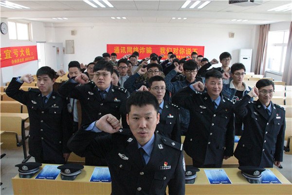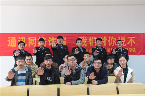 在別開生面的“預(yù)防通訊網(wǎng)絡(luò)詐騙”主題班會(huì)上,白楊派出所副所長方韜警官給同學(xué)們介紹了高教園區(qū)近期發(fā)生的通訊網(wǎng)絡(luò)詐騙案例,揭露了犯罪分子常用的作案手法。民警們帶領(lǐng)同學(xué)們一起學(xué)習(xí)了簡明扼要、朗朗上口的防騙口訣。通過學(xué)習(xí)了這些鮮活的案例,掌握了這些簡單易行的防范技巧,同學(xué)們在防范通訊網(wǎng)絡(luò)詐騙承諾書上鄭重的簽下自己的名字。