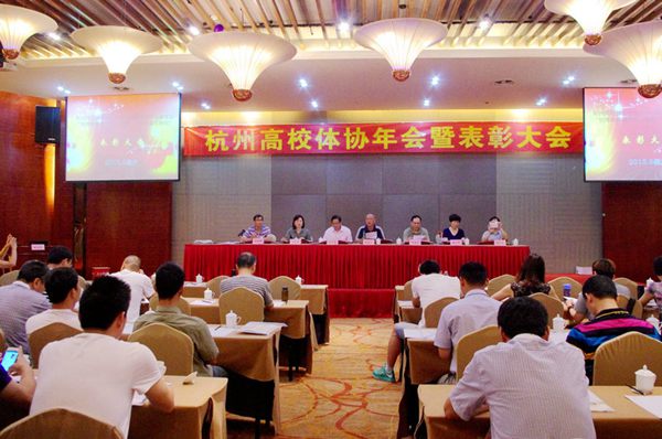 “杭州市高校體育協會2014-2015學年年會暨優秀體育俱樂部和優秀指導教師表彰大會”于2015年6月26日在浙江桐廬召開,浙江省大學生體育協會領導、杭州市各普通高等學校體育部(室)主任及優秀體育俱樂部指導教師70余人參加會議。
