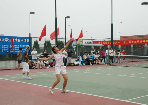 浙江省第十二屆大學生運動會甲組網球團體比賽于今天上午結束,我校代表隊表現出色,奮勇奪得甲組團體第三名,為我校奪得榮譽。   比賽中,我校代表隊首先出場的女單1號、男單2號選手由于參賽經驗不足,稍顯緊張,先后負于對手嘉興學院,形勢非常不利。但是在隨后出場的男單2號,混雙、男雙的比賽中,我校代表隊的選手頂住壓力,奮起反擊,分別以6:1;6:2;6:1的較大比分擊敗對手贏得比賽。