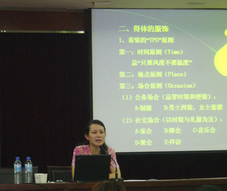 陳老師為大家講述了什么是商務禮儀、商務禮儀的作用以及如何正確運用商務禮儀,并結合中外典型實例和自己的親身經歷從商務個人禮儀、辦公室禮儀、賓館服務禮儀和餐飲服務禮儀等方面商務禮儀進一步做了講解。講座深入淺出、精彩動人。