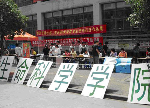 5月13日,生命科學學院團總支學生會組織2006級各班在新食堂前舉行了“知識引領生活”為主題的學生課外科技作品展活動。