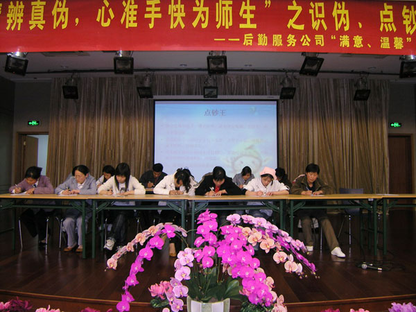 為了有效地提高后勤服務公司員工的服務技能,又好又快地為廣大師生服務,近期,后勤服務公司財務部舉辦“滿意、溫馨”服務年之“火眼金睛辨真偽,心準手快為師生”活動。近百名員工參加了活動?;顒佑杉賻胖R、速算技巧、點鈔技巧講座和識假、點鈔、心算技能比賽兩個部分組成。
