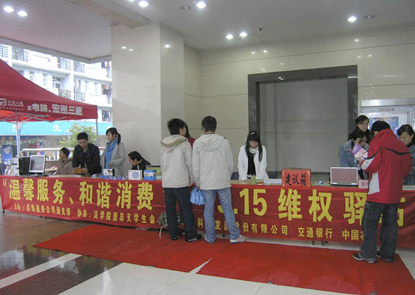 為了進一步提高后勤青年團員服務公司服務師生的創新意識,充分發揮團員的活力和創造力,在“3.15”國際消費者權益保護日來臨之際,后勤團支部積極組織開展“3.15”維權系列活動。   本次“3.15”活動圍繞“溫馨服務、和諧消費”的主題展開。整個活動由三個子活動組成,后勤團支部和法學院團總支學生會聯合舉辦的消費者權益保護法普及后勤服務滿意度問卷調查;中國農業銀行和交通銀行舉辦的假幣識別;宏圖三胞科技發展股份有限公司舉辦的IT產品真偽識別方法、鑒別標準介紹及電腦免費檢測保養。本次活動得到了學校領導和相關部門的大力支持,活動收到了如期的效果。