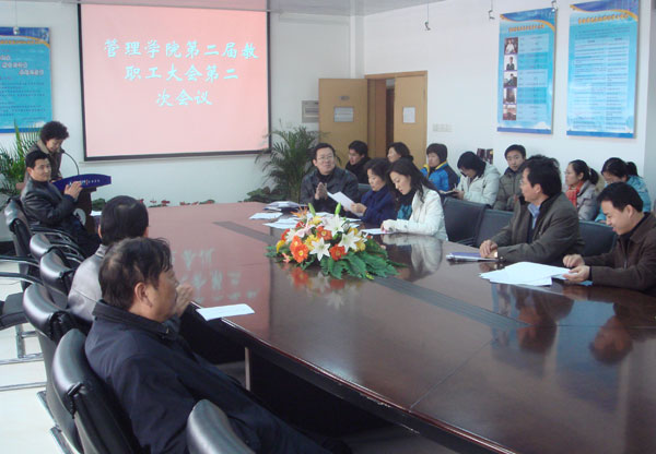 2007年1月4日,管理學院在格致南樓307召開了第二屆教職工大會第二次會議,會議特邀校工會主席金國雄參加,會議由管理學院工會主席劉洋主持。   大會聽取并審議了宋明順院長的學院年度工作報告、年度財務報告,聽取并審議了分工會主席劉洋所做的管理學院分工會2006年度工作總結及財務報告。大會還以全票通過了管理學院2006年度分配方案。最后,學院黨總支書記熊明華作了總結發言。