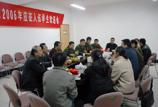 12月8日下午,學校在明德樓A105會議室,召開2006年應征入伍學生歡送會,歡送余靈、胡淵斐、白鑫樺、周圍等四位同學應征入伍。保衛處、學生處及四位同學所在分院領導、班主任、輔導員出席了歡送儀式。   會上,保衛處處長張健同志致辭,殷切希望投身軍旅生活的同學珍惜這次機遇,不辜負黨和人民的重托,虛心向戰友們學習,勇于進取,早日成為一個政治合格,軍事過硬,作風優良的軍人。隨后,保衛處楊嘯銘副處長介紹了今年的征兵工作情況。   最后,分院領導對入伍學生提出了囑托,并代表學校向四位應征入伍學生贈送了紀念品。