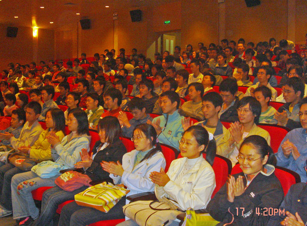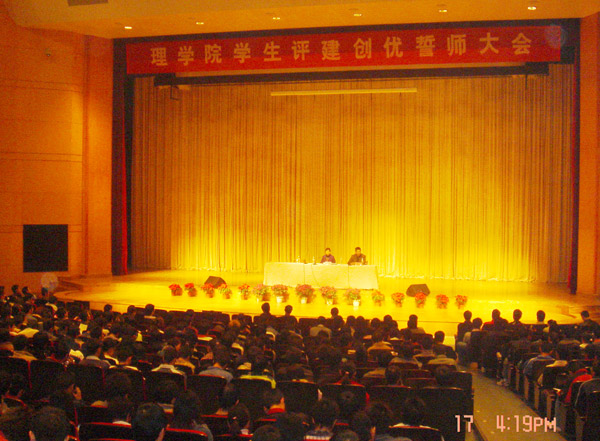 理學院于11月17日下午16:00在嘉量大會堂舉行了全體學生評建創優誓師大會。學院領導、全體班主任、輔導員和全體學生出席大會。   會上,院長葛洪良作了重要講話,他指出,學校的評建創優工作已到了最后沖刺階段,希望每位同學都要樹立“校興我榮,校衰我恥”的主人翁意識,尤其是黨員要起到戰斗堡壘和先鋒模范帶頭作用,亮身份、強意識、促發展、展學風、促文明,在接下來的評建創優工作中做出自己的貢獻。   黨總支書記毛成指出,學生是評估工作的最大受益者,也是學校評建工作的積極參與者,她要求全體同學要熟讀并深刻領會“評估期間同學們的具體要求”,認真學習評估手冊,充分理解熟悉學校的基本情況、辦學特色、辦學理念等,自覺參與到與評估有關的各項活動,為評建創優工作添磚加瓦;希望廣大同學要以飽滿的熱情及良好的精神風貌投入到此次迎評創優中,體現出我們量院人積極進取,蓬勃向上的精神。她強調,每位同學一定要端正態度,注意自己的言行,平時佩戴校徽,黨員佩戴共產黨員牌,爭取在專家到來時將量院學子的最佳風采展示在他們面前。   最后,04應物2班的辦主任周云老師代表全體班主任表示,所有班主任將以實際行動,與同學們共同努力,為學校的評建創優、為量院的發展做出自己的貢獻。   04信算1班的詹婷、03信算1班的劉國慶同學分別代表學生黨員、全體學生發言,他們向全體同學發出倡議,一定要樹立主人翁意識,以高昂的斗志投入到此次評估中,從我做起,從小事做起,為學校的評建創優工作做出應有的貢獻。