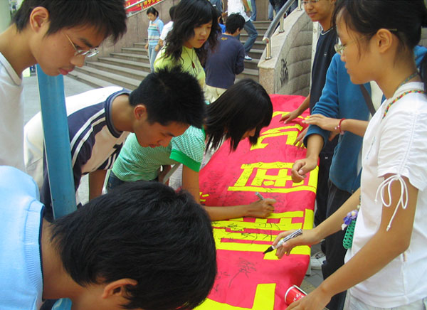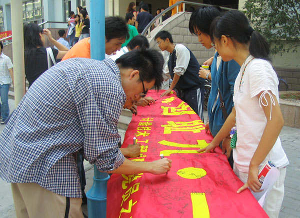 9月18日,凄厲的防空警報響徹上空。為紀念“九一八事變”75周年,計量技術工程學院黨員之家在學校生活區舉行了“血雨腥風總有涯 牢記國恥九一八”的大型簽名活動。整個活動井然有序,在那塊長長的橫幅上,社區的工作人員,剛下課的同學和老師們都鄭重地簽上了自己的名字,留下了我們共同的心聲:牢記歷史,勿忘國恥;珍愛和平,愛我中華。