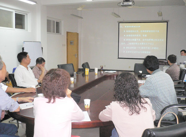 9月15日下午1:30,理學院數學系在格致中樓503舉行應用數學學科按博士點標準建設匯報會。校研究生部主任李肖偉教授出席了會議,理學院副院長、數學系主任、應用數學學科負責人曹飛龍教授向與會人員匯報了應用數學學科按博士點標準建設的情況。應用數學學科全體教師、數學系全體博士參加了會議。   曹飛龍教授的匯報主要從調研情況、現狀分析、措施與設想等三個部分詳細分析了應用數學學科按博士點標準建設的已有基礎、面臨的困難和需要改進的措施。曹飛龍指出,數學學科現有教授10人,博士15人,學術資源比較豐富,而且有高質量論文發表,有一定的基礎,但也存在一些困難。在未來的一段時期,學科要有目的地引進較高水平的教授、博士,鼓勵青年教師報考博士點建設研究方向的博士生,有目的地派出骨干教師到國內外著名大學學習進修;要采取措施吸引全系教師參加學科建設;要創建學術交流平臺“數學科學研究所”,加強對外學術交流;要進一步加強學科資料室建設。   在會上,謝庭藩教授強調,“沒有強大的理科,就沒有強大的工科”,辦好大學,一定要搞好數學。這幾年,數學系發展比較快,但還不能適應學校的發展,還要加快發展速度。建設應用數學博士點是把我校建成國內知名大學的必要條件,這項工作一定要做好。搞數學研究必須要有資料室,要進一步加強應用數學學科資料室建設。謝教授還指出,應該成立數學科學研究所作為學術交流平臺,為對外學術交流創造良好的條件。他還鼓勵年輕教師,在教學任務比較重、學校評估工作比較繁忙的情況下,也要多讀書多做學問。每天抽出一點時間,長期堅持下來就會有效果。   楊汝月教授指出,資料室最好多購置一些國外雜志,老師們可以盡快了解學科前沿信息;學科要為青年教師申請項目多做工作,為青年教師成才創造條件。   周信龍教授向大家介紹了在德國留學、工作的情況,鼓勵青年教師扎扎實實地做學問,多提問,多交流,增進合作,快速提高科研水平。   最后,曹飛龍教授提議定期舉行學術報告活動,教授和博士定期報告自己的工作,活躍學術氛圍,受到大家的一致贊同。   這次會議較全面總結了近幾年應用數學學科建設的成果、存在的困難以及改進的措施,分析了今后努力的方向,將對我校應用數學學科建設產生深刻影響