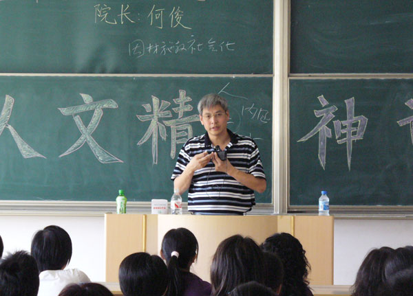 9月18日下午2:00,人文社科學院院長何俊在環宇樓A301教室為06級新生舉辦了一場以弘揚人文精神為主題的學術講座。教室里座無虛席,同學們興致盎然,滿懷期待。   何俊院長以《論語》中“我欲仁,斯仁至矣”為開篇主題,并結合學院的辦學理念——培養身心健康的人、自我更新的人、服務社會的人,為新生們進行了一場深入淺出、內涵豐富的精彩講座。他強調同學們進入大學,是完成社會化的關鍵時期,每個同學都應該認清自己的特點“因材受教”。   近兩個小時的講座同學們一直聚精會神,充分表現出他們尊重學術,尊重權威的精神,以及渴望知識,熱愛學習的迫切心情。講座結束后他們紛紛表示很受鼓舞,對專業和前途充滿信心。