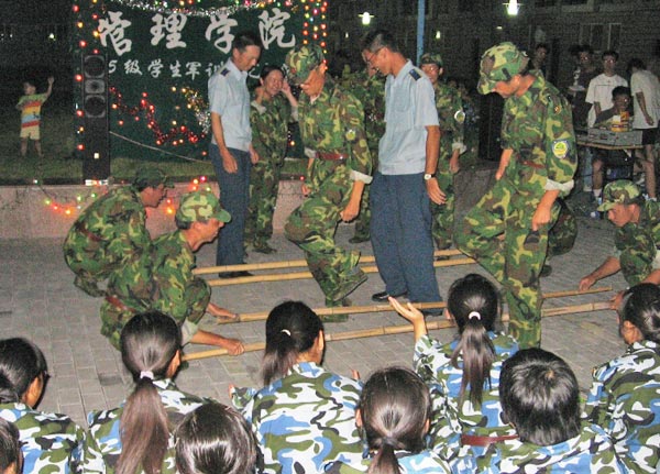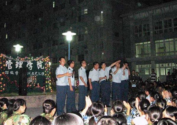 8月27日晚上八時,管理學院在生活區二號樓前舉辦了一臺既緊扣軍訓主題又不失生動活潑的文藝晚會,管理學院全體05級軍訓學生參加了晚會。