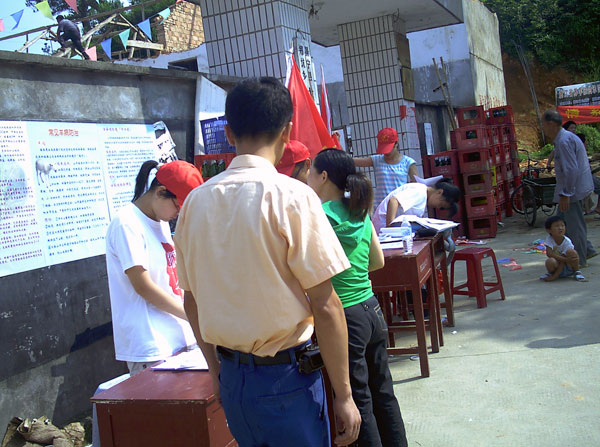 隊員們首先將事先已經制作好的有關人畜以及水稻等的常見傳染病的防治的宣傳海報張貼在鄉中心小學門口的宣傳欄里。考慮到當地居民較為分散的特點,在葉所長的建議下,隊員們決定采用上門派送宣傳資料的方式來具體展開本次宣傳活動。在分發資料的過程中,通過葉所長的介紹以及大家的親身體驗,隊員們對當地醫療衛生情況有了一個較為全面的了解。由于當地的村民大多是不識字的,對于類似的衛生宣傳活動他們的積極性并不是很高;這給他們工作的開展造成了極大的不便。另外,當地諸如肺炎、肝炎等傳染也時有發生;甚至艾滋病在景寧這樣一個地處高山的地區也有病例出現。對此,葉所長表現出了極大的擔憂——如何有效的在當地開展預防艾滋病的宣傳活動可謂是任重而道遠。