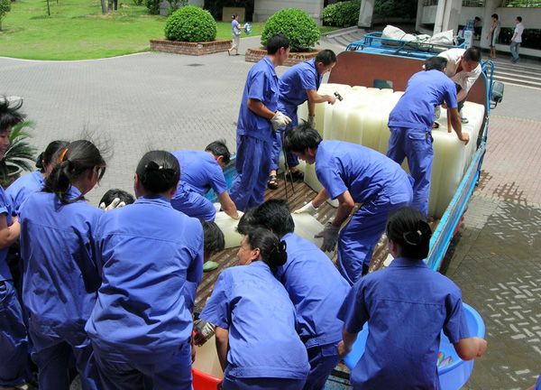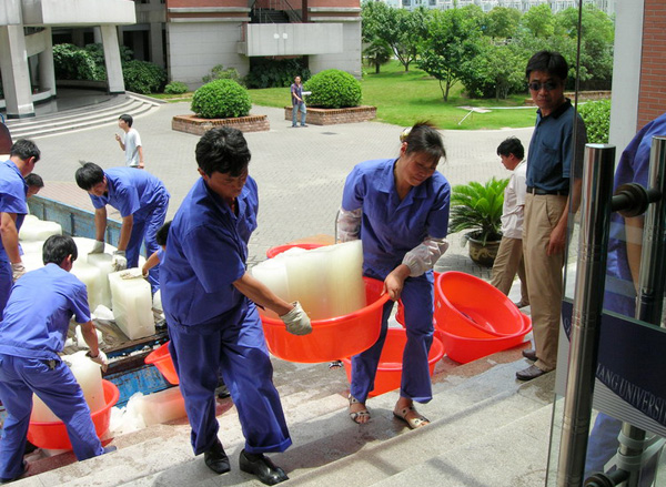 連續九天,各區塊員工在做好教室日常保潔工作的前提下,每天早上5:00開始搬運冰塊。雖然搬冰工作很辛苦,但員工們個個都爭先恐后,干的汗流浹背,她們四人一組,在來來回回的樓層間穿梭,特別是中午12:00的搬冰工作,由于近幾天天氣特別炎熱,不少員工中暑了,仍然堅持工作。