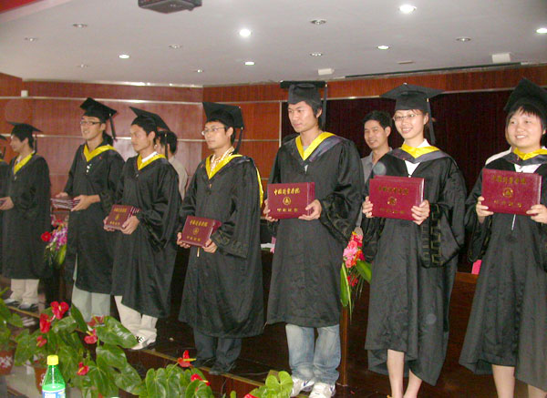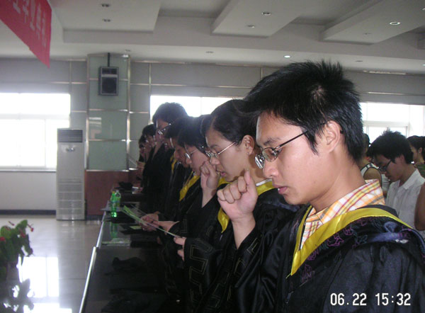 6月22日下午3點,理學院在明德樓報告廳隆重舉行了2006屆畢業典禮。黨政領導、各系部負責人以及畢業班班主任、輔導員和全體畢業生參加了典禮。畢業典禮由黨總支書記毛成主持。   畢業典禮在莊嚴的國歌聲中拉開帷幕。首先由葛洪良院長致詞。他代表學院向即將告別母校,踏上人生新征途的140名畢業生表示最熱烈的祝賀,勉勵全體畢業生在新的工作崗位上努力奮斗,為社會作出貢獻,為母校爭光。   理學院王新慶博士代表全體教師表達了他們對廣大畢業生的衷心祝愿和殷切期盼。02信算2班劉獻同學代表全體畢業生對栽培自己的母校表達了感恩和留戀之情,衷心祝福學校的明天更美好,祝愿廣大畢業生取得新成績,為學校做出新貢獻。隨后,全體畢業生莊嚴宣誓:“銘記老師教誨,履行時代使命,以國家利益為重,崇尚科學,追求真理,團結、嚴謹、勤奮、進取,做有益于人民的人,為母校爭光,為祖國昌盛、人類進步奮斗終身?!?   曹飛龍副院長在典禮上宣讀了理學院2006屆省級、校級優秀畢業生名單。隨后,出席典禮的領導為省級和校級優秀畢業生代表頒發了榮譽證書,為畢業生代表頒發了學位證書和畢業證書。
