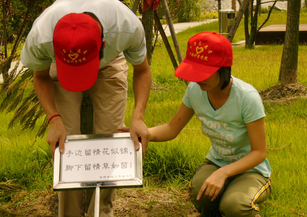 經(jīng)過(guò)前期的充分準(zhǔn)備,5月24日,管理學(xué)院志愿者們頂著烈日在校新食堂門(mén)口舉行了“手邊留情花似錦,腳下留情草如茵”豎幅簽名活動(dòng)。緊接著,5月25日,雖然天公不作美,但志愿者們服務(wù)熱情絲毫不減,大家冒著大雨在校教學(xué)區(qū)開(kāi)展了保潔活動(dòng),主要是清除了校園內(nèi)的垃圾及草地上的雜草,并在清潔后的草地上插入了愛(ài)護(hù)草地的提示牌,見(jiàn)證了管理學(xué)院學(xué)子“我為評(píng)估做貢獻(xiàn)”的摯言。