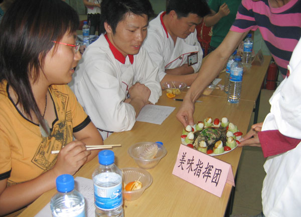 本次比賽分設(shè)兩個(gè)環(huán)節(jié),分別為定向菜和創(chuàng)意菜的比拼。在定向菜展示環(huán)節(jié),六支隊(duì)伍均干凈利落地完成了規(guī)定菜色——番茄炒蛋的熱烹,且色香味俱全,各具特色。接下來是創(chuàng)意菜的比拼,六支隊(duì)伍各顯其能,爭相使出十八般武藝,頗具大廚風(fēng)范。最終,“美味指揮團(tuán)”以出色的表現(xiàn)和一道別具特色的西施豆腐贏得了比賽的勝利。比賽中最為精彩的是上屆冠軍隊(duì)伍與本屆冠軍隊(duì)伍同臺(tái)競技的冠軍PK環(huán)節(jié),選手們以冬瓜為原料,比試雕功,為同學(xué)們展示了量院學(xué)子的廚藝水準(zhǔn)。