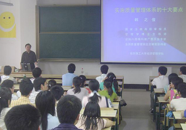 韓之俊教授系南京理工大學教授和博導,是全國質量管理和六西格碼管理的專家。在這次講座中,韓教授從一個中心,QMS的兩個自我診斷的措施,提高三個滿意度,四大過程管理,五種QMS文件、制定方針的五點原則、QM五種統計技術,六種書面程序,管理評審的7種輸入、文件控制的7點要求、TQS的7種工具,建立QMS的八個步驟、質量管理八項原則,9個重要術語,質量改進的十項活動等十個方面向與會同學詳細分析了質量管理體系的要點和準則,讓與會同學對質量管理認證有了更深刻的認識。
