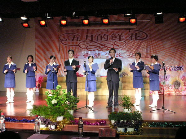 當天6:30,校合唱隊的小組唱“五月的鮮花”拉開這次活動的序幕。為了展現良好的精神風貌,各二級學院都精心進行了編排,表現的形式也較以往豐富了許多:法學院將《滿江紅》、《青年與中國》等不同時代表現愛國情感的詩歌組合起來,通過充滿感情的朗誦,讓人仿佛回到了那個令人激情澎湃的年代;機電工程學院則象合唱一樣,將詩歌分成了領誦、群誦,隨著詩歌的節奏把情感的表達推向了高潮;管理學院還為詩歌朗誦配上了舞蹈,通過現場氣氛的渲染,強化了詩歌的感染力。校廣播臺演出的節目《我驕傲,我是中國人》把這次活動的氣氛帶到了頂點,現場的觀眾用熱烈的掌聲給予了極大的共鳴。