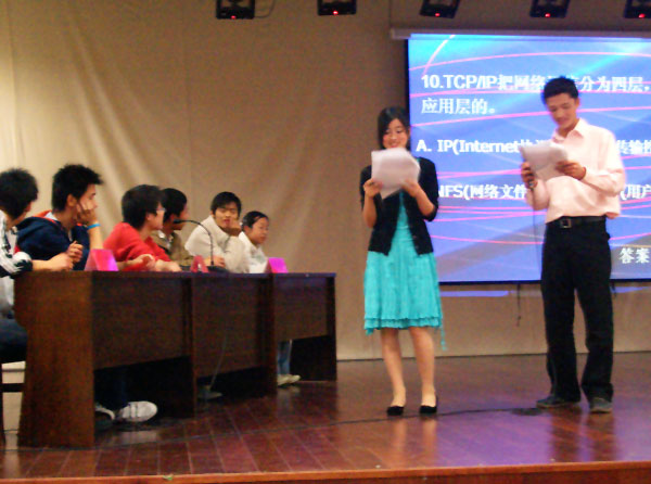 本次比賽是由經過20多支初、復試激烈競爭勝出的五支隊伍參加總決賽的。比賽分為必答題和是非搶答題兩個環節。必答題對競賽選手網絡常識要求比較高,體現了選手們的知識積累。而搶答環節采用搶凳子的方式體現了競賽的趣味性。