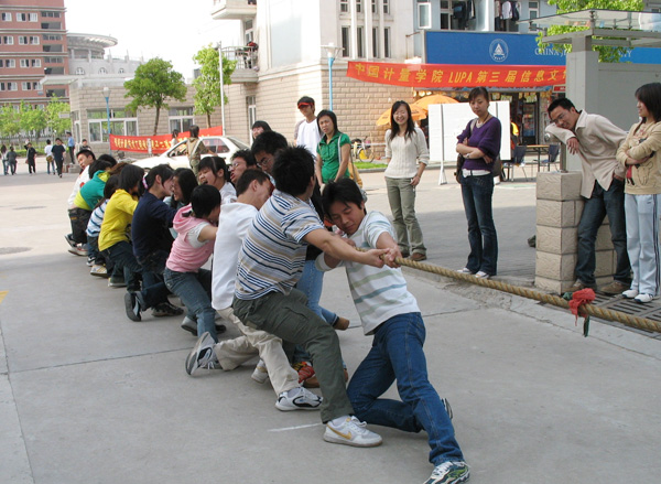 4月24日下午,人文社科學院首屆廣告文化藝術節第一個項目"廣告人拔河比賽"在新食堂門口舉行.由學生會體育部組織的的此次比賽得到了廣泛的關注.全院15個班級參加了比賽。   熱火朝天的場面,震耳欲聾的吶喊聲吸引了眾多師生的駐足觀看.比賽采用淘汰制,最后04公管3班、04廣告2班、04廣告3班分獲了比賽的一、二、三名.   此次比賽作為廣告文化藝術節開幕式后的第一個項目,目的在于提高班級凝聚力、對于弘揚人文精神中的團結互助、拼搏進取的內涵,提高學生綜合素質中的團隊合作精神,非常有益.