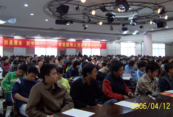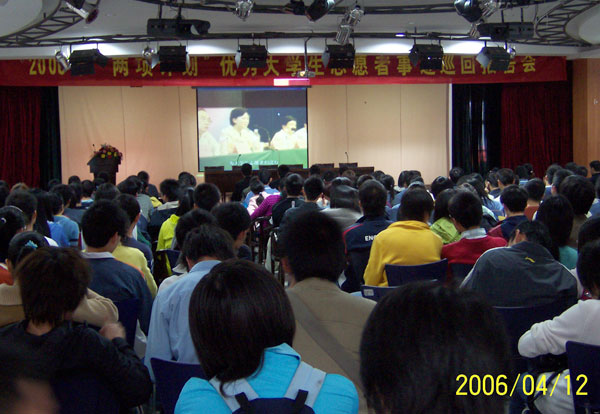 4月12日下午, 2006年浙江省服務我國西部和我省欠發達地區優秀大學生志愿者事跡報告會在我校學生活動中心多功能廳舉行。省學聯執行主席張桃紅、浙江省服務“兩項計劃”的優秀志愿者代表和我校近五百名師生出席了報告會。   校團委書記巢嶺在會上致辭,他對“兩項計劃”優秀大學生志愿者來我校傳經送寶表示歡迎。希望越來越多的同學加入到“兩項計劃”的工作中去,到西部、到基層、到祖國和人民最需要的地方,發揮聰明才智,建功立業,爭做兩項計劃志愿者,踐行社會主義榮辱觀,以自己的實際行動展現當代大學生的風采。   優秀大學生志愿者代表趙之愷、吳方彬、陳彥中、徐根方等四人在會上作了事跡報告。趙之愷是一名西部志愿者,他用樸素的語言講述了在服務過程中對西部的認識,在服務期間,他與其他志愿者一起,用自己的津貼建立了一個基金,專門幫助那些家庭貧困的學生,一次次地親身經歷和受助家庭的質樸真情,不僅讓他為這些孩子在貧困中不懈努力的堅強而震憾,也讓他為這些西部農民的善良和真誠所感動。吳方彬是服務于浙江磐安的一名志愿者,他用自己的計算機專業特長為當地工業園區的創建和發展作出了貢獻,一年服務期滿后他回到杭州,被杭州卷煙廠錄用,但磐安當地領導和群眾一次次的邀請,讓他放棄了優越的工作條件,回到了磐安工業園區工作,他說,把他留在那里的,除了一年志愿服務所結下的情誼,還有發展這些欠發達地區經濟的這份事業。陳彥中是一名學醫的畢業生,在浙江遂昌志愿服務的一年里,為了更好地與病人溝通,他努力學會了當地的方言,在服務過程中,他得到了在大城市醫院里所得不到的鍛煉機會,提高了醫療水平,也以真誠的付出成為了深受當地群眾喜愛的一名醫生。服務期間的收獲與成長讓他也選擇了留在那個崗位上,用今后的人生繼續走好這條服務欠發達地區的道路。徐根方是在四川最邊遠的金陽縣服務的志愿者,在那里支教期間,他不僅教學生讀書,而且為了讓學生不要在每餐只喝咸菜湯,他每周走幾十公里山路,到臨近的云南境內的集市用自己的服務津貼購買豬肉和新鮮蔬菜,為學生補充營養。   志愿者的報告以樸實的語言、感人的事跡、青春的激情、無私的奉獻,贏得了臺下師生了一陣又一陣的熱烈掌聲。隨著報告會的落幕,我校2006年兩項計劃的招募工作也即將啟動。